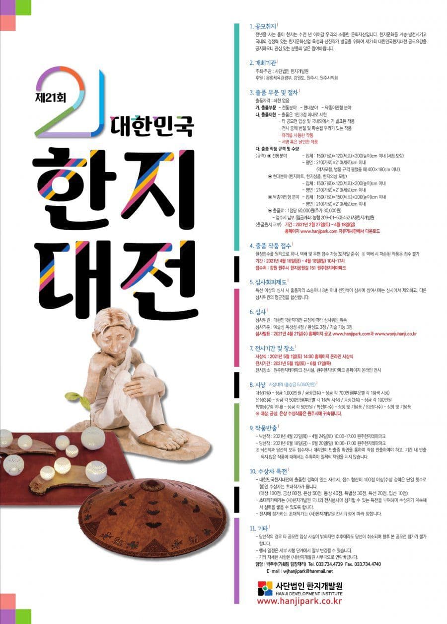 천년을 사는 종이 한지는 수천년 이어갈 우리의 소중한 문화자산입니다. 한지문화를 계승·발전시키고 국내외 경쟁력 있는 한지문화산업 육성과 신진작가 발굴을 위하여 제21회 대한민국한지대전 공모요강을 공지하오니 관심 있는 분들의 많은 참여바랍니다.
