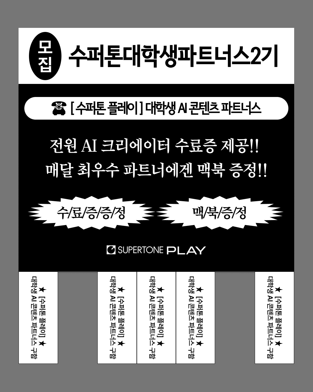 수퍼톤 플레이에서 ✨대학생 AI 콘텐츠 파트너스✨를 모집합니다!수퍼톤 플레이를 활용하여 콘텐츠를 제작해보고 싶은 대학생 누구나 지원 가능해요!