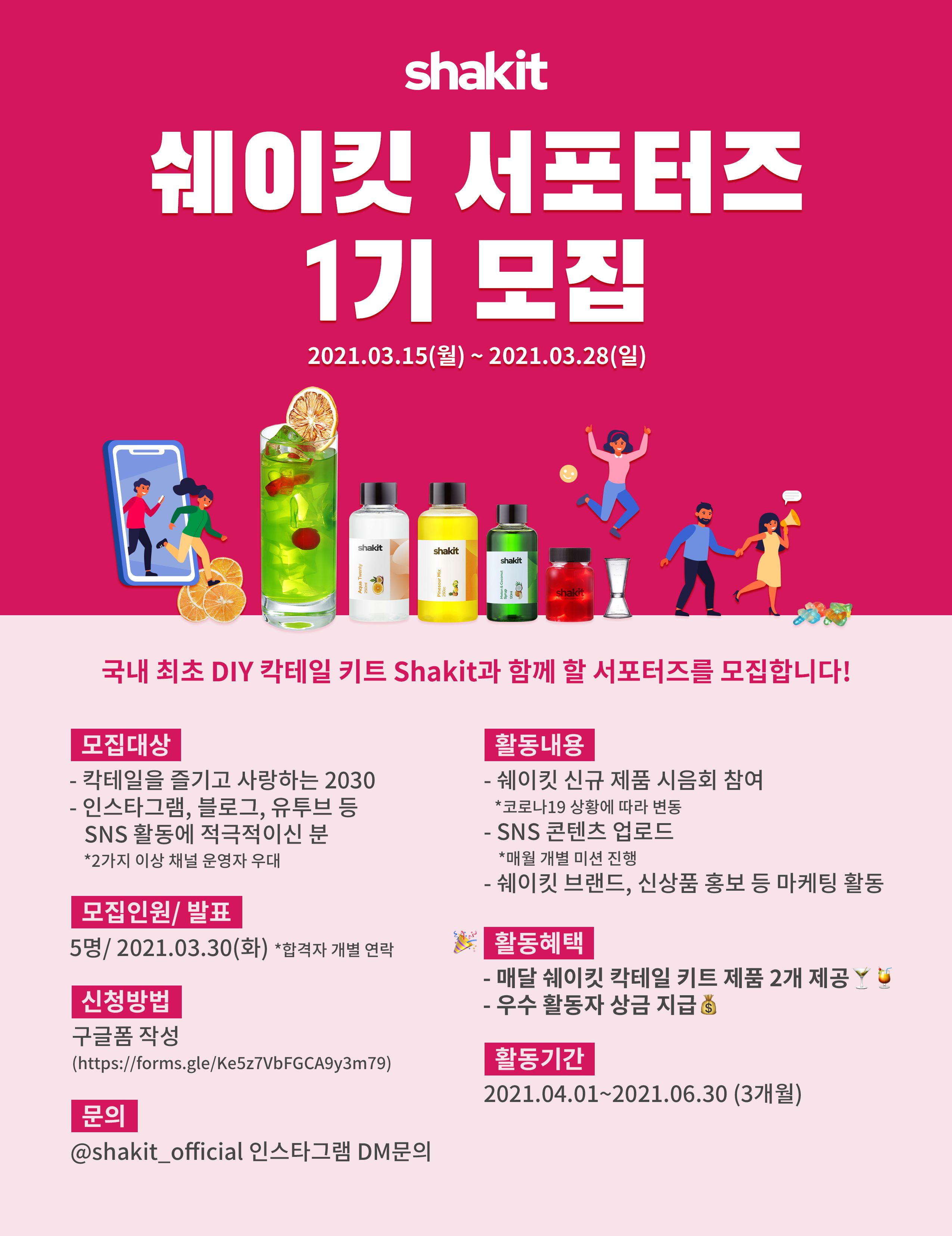 "국내 최초 DIY 칵테일 키트 Shakit"과 함께 할 서포터즈를 모집합니다!