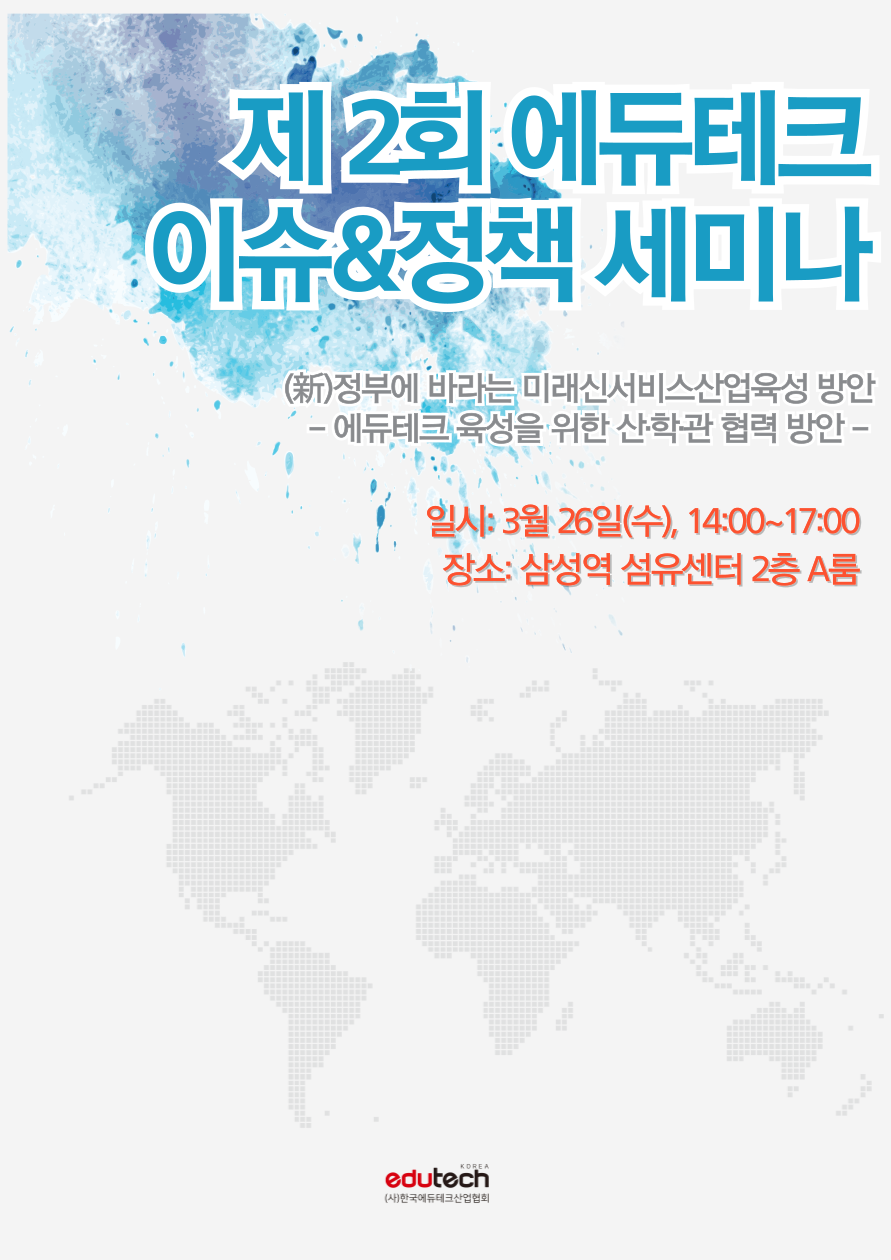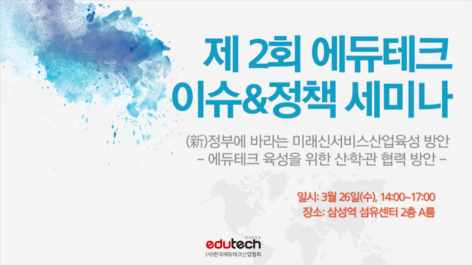 한국에듀테크산업협회에서는 「(新)정부에 바라는 미래신서비스산업 육성 방안: 에듀테크 육성을 위한 산·학·관 협력 방안」을 주제로 제2회 에듀테크 이슈&정책 세미나를 개최합니다.