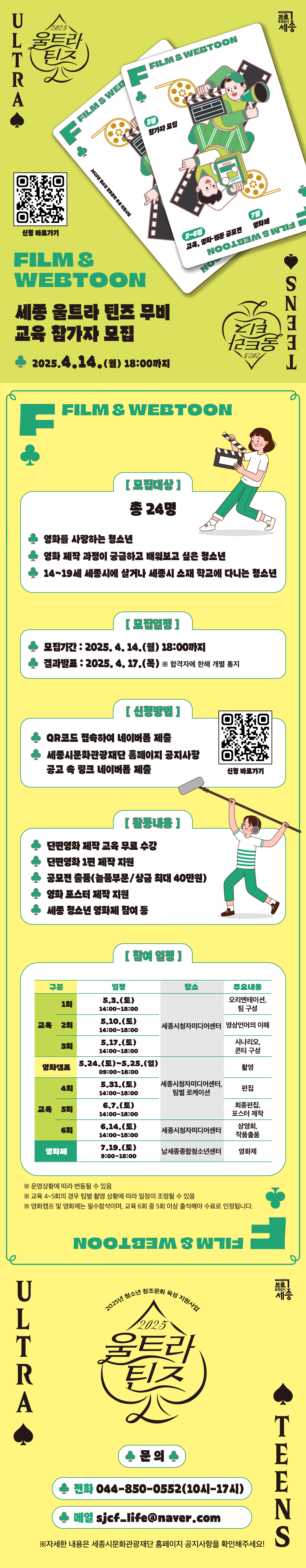 * 본 프로그램은 <2025년 청소년 창조문화 육성 지원 사업>의 영화분야로, 5월에는 영화 및 웹툰 공모전이 진행됩니다. (영화 - 전국 14~19세 청소년 / 웹툰 - 세종시 12~19세 청소년)