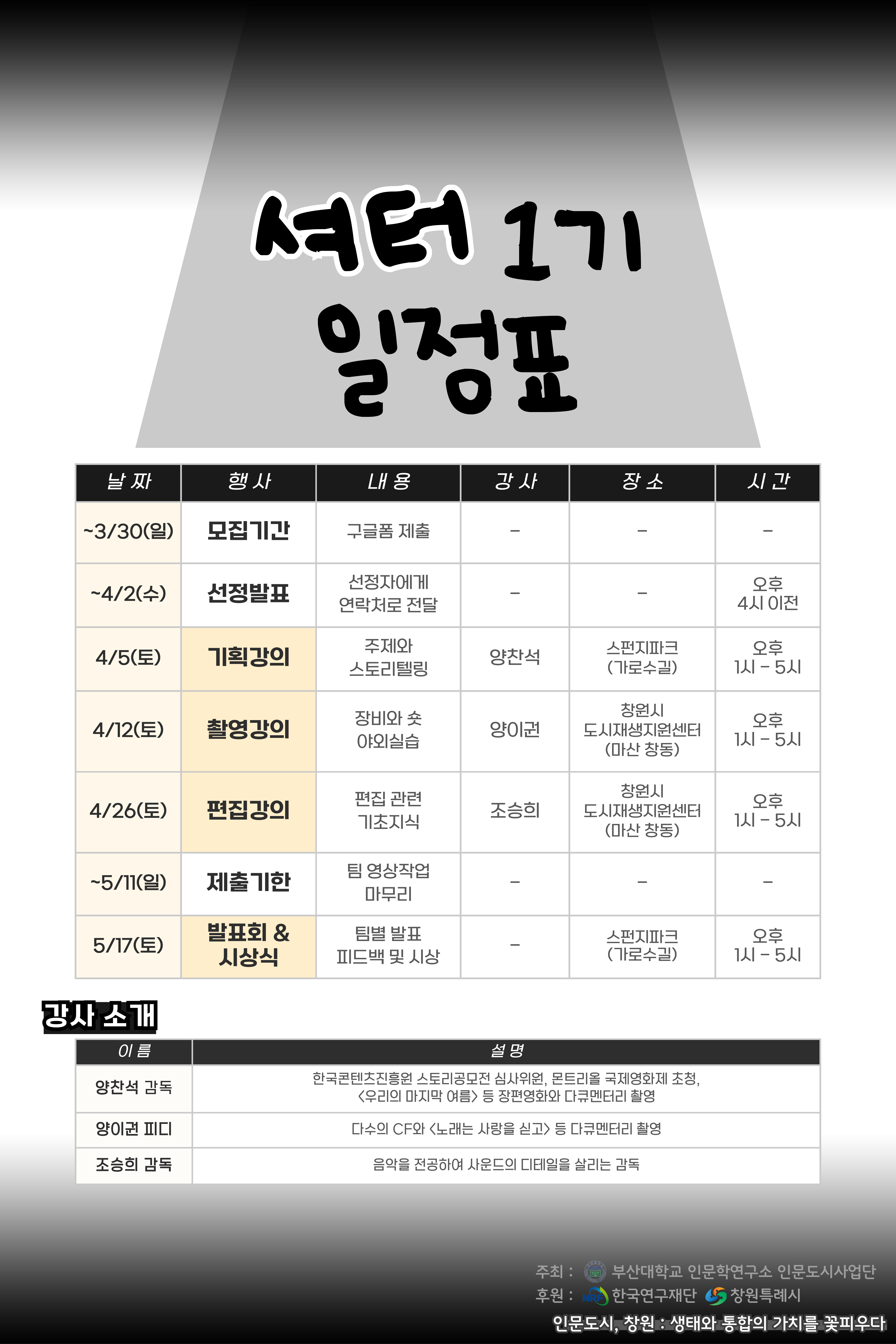 ※ 4/26일 강의 이후 시상식(5/17) 전까지 자율적으로 편집을 마치고 팀별 편집본을 전달합니다.