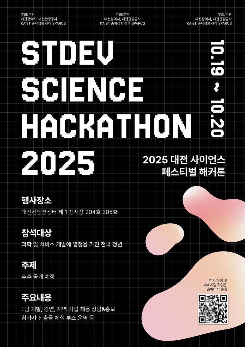 사단법인 STDev와 KAIST 총학생회 산하 특별기구 SPARCS가 주관하는 STDev Science Hackathon 2025에서 창의적인 아이디어와 실행력을 가진 전국의 기획자, 개발자, 디자이너를 모집합니다.