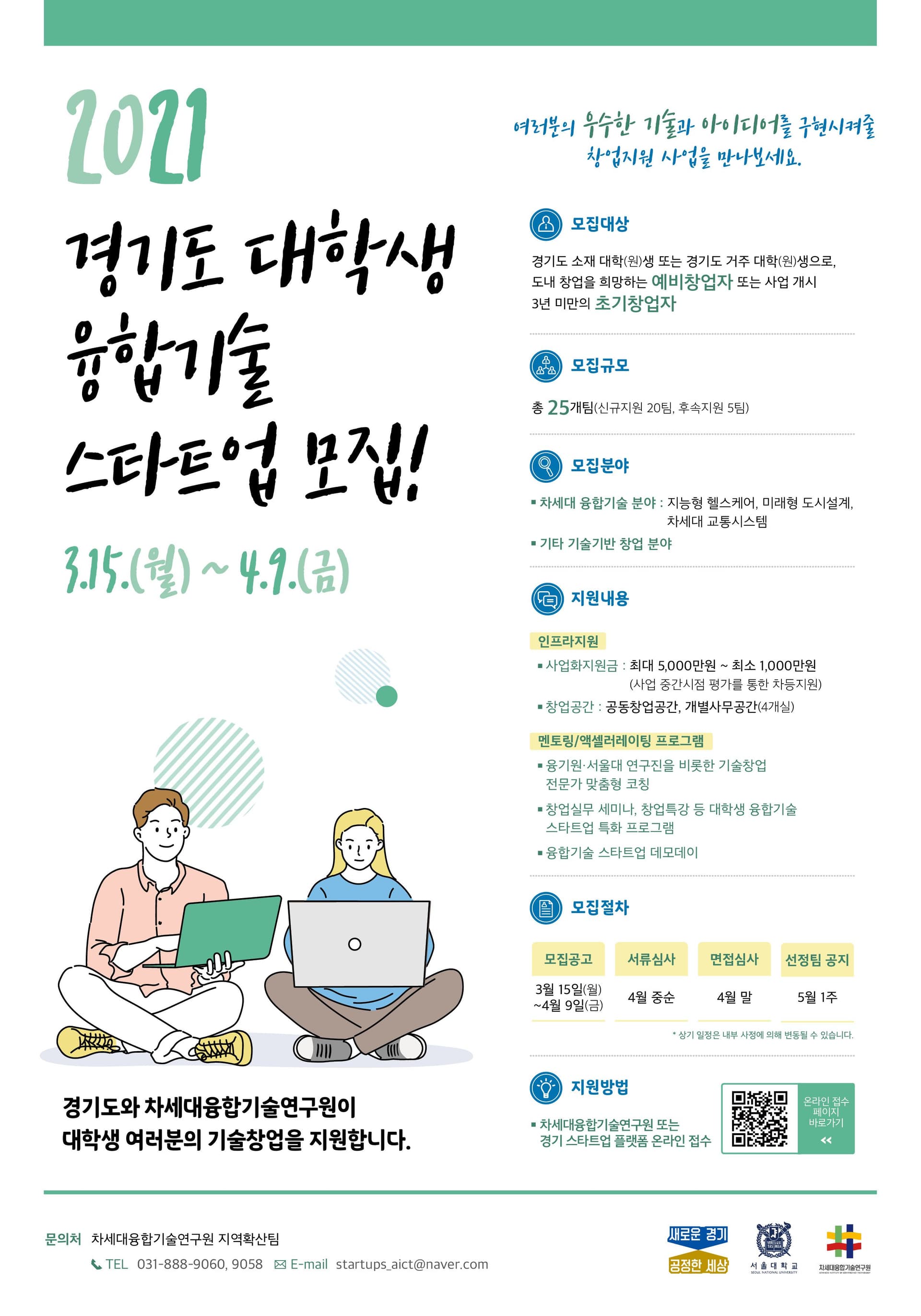 - 융기원 홈페이지(aict.snu.ac.kr) 또는 경기 스타트업 플랫폼(gsp.or.kr) 온라인 접수