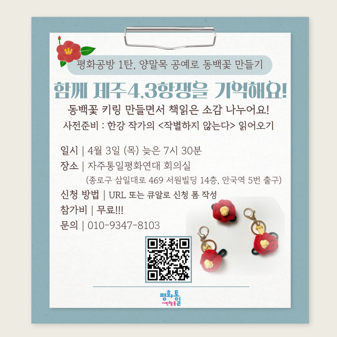 4.3항쟁 78주년을 맞아 '작별하지 않는다'를 읽고 함께 소감을 나누고, 4.3항쟁의 의미를 함께 기억하겠다는 마음을 담아 동백꽃 키링을 만들어보아요!