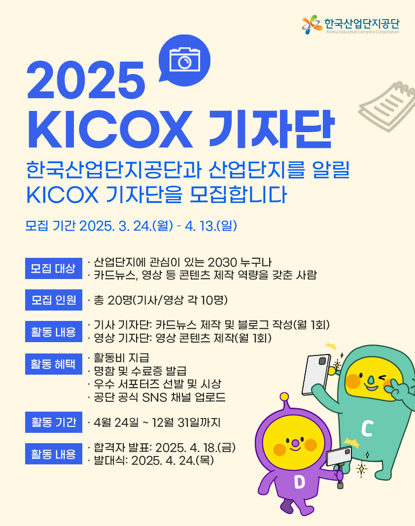 한국산업단지공단과 산업단지를 알릴 KICOX 기자단을 다음과 같이 모집합니다.🙌