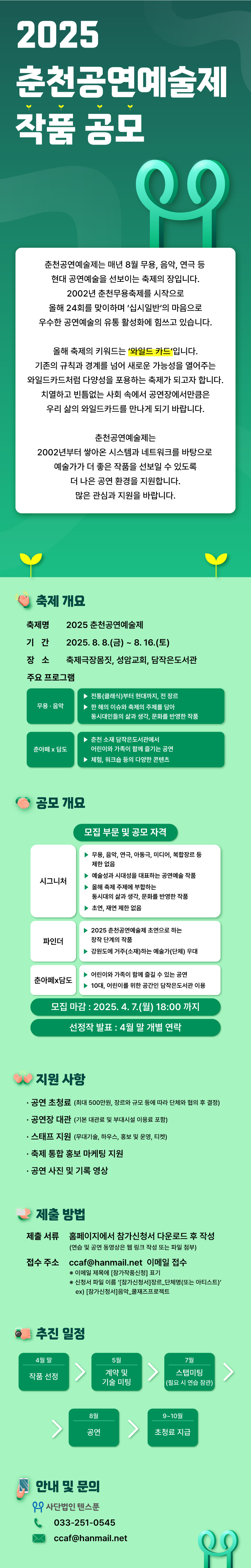 춘천공연예술제는 20002년부터 쌓아온 시스템과 네트워크를 바탕으로 예술가가 더 좋은 작품을 선보일 수 있도록 더 나은 공연 환경을 지원합니다. 많은 관심과 지원을 바랍니다.