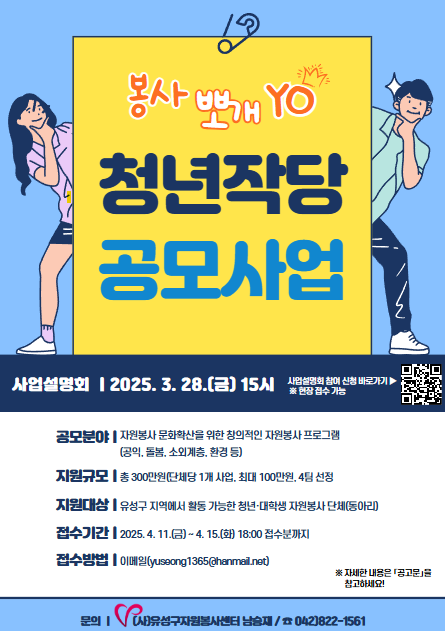 사업설명회: 2025. 3. 28.(금) 15:00-16:00 / 유성구자원봉사센터(대전 유성구 유성대로 730번길 51, 유성구지역협력센터 1층)