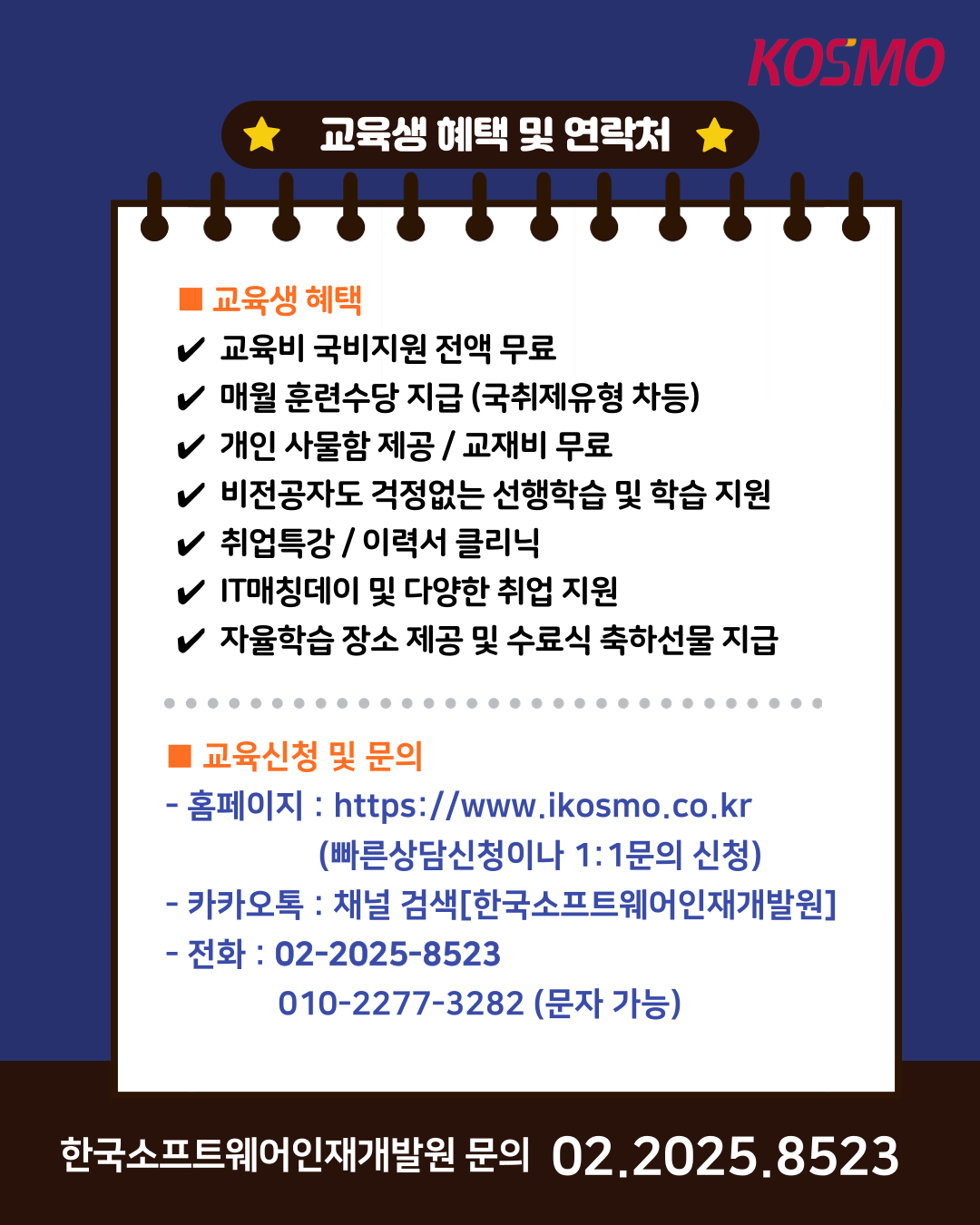 - 홈페이지 : https://www.ikosmo.co.kr (한국소프트웨어인재개발원)