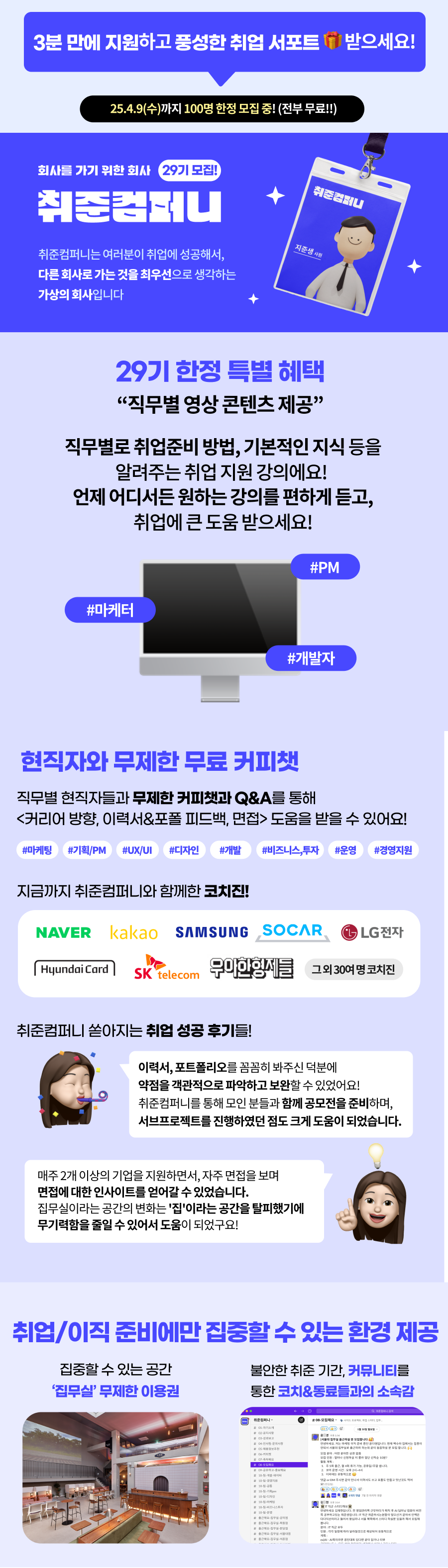 취업/이직 준비하고 계시는 분들을 위해 근무 환경부터 취업/이직 준비를 위한 프리미엄 서비스까지 모두 지원하고 있는 취준컴퍼니입니다.