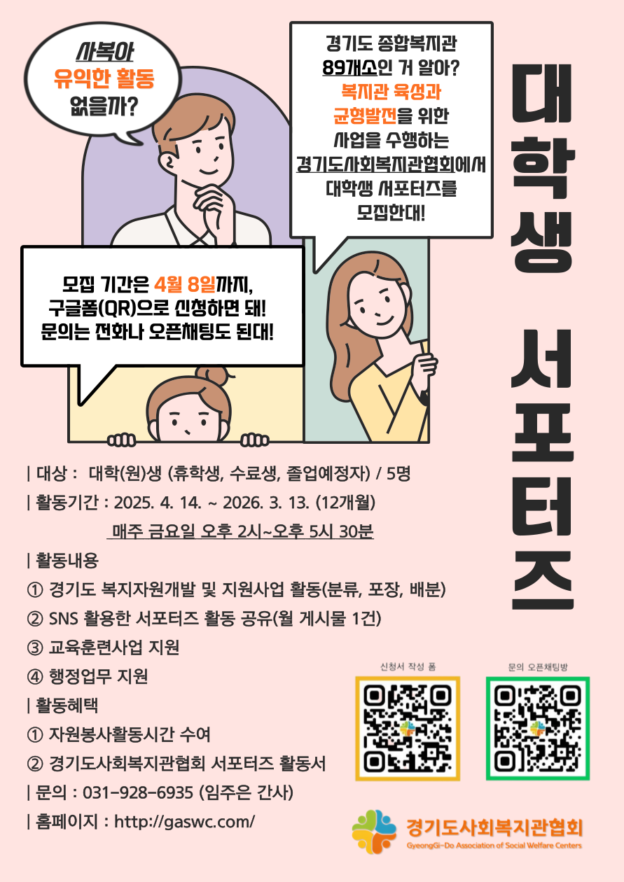 4월 8일까지 금요일 오후 2시~오후 5시 30분 유익하게 보낼 예비 사회복지사를 찾습니다📢