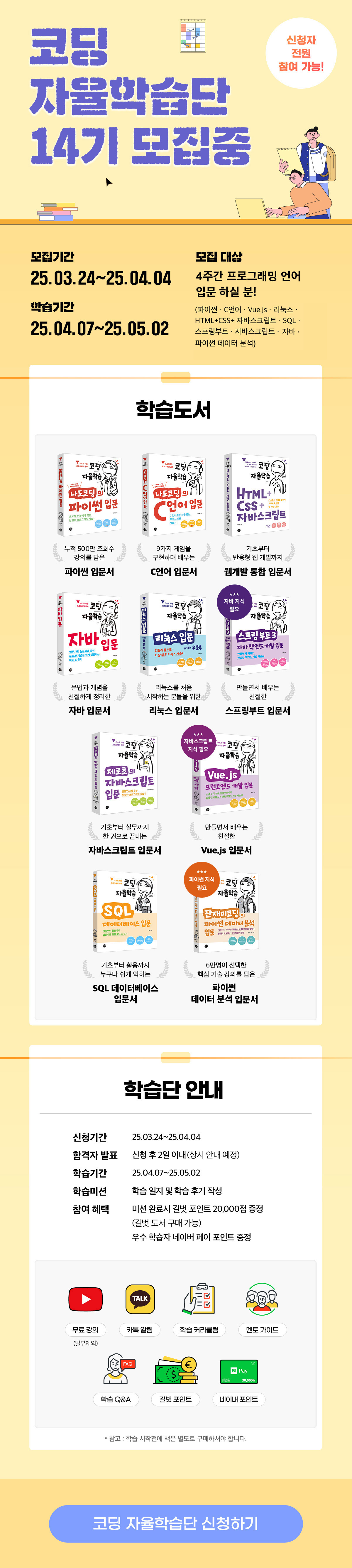IT입문서 <코딩 자율학습>시리즈 도서로 한 달 동안 1종의 도서 완독을 목표로 하는 프로그램입니다.