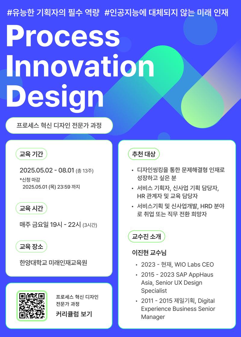 해당 포스터 QR 스캔 or 링크 접수 (https://cce.hanyang.ac.kr/front/ko/master/expert1/processdesign)