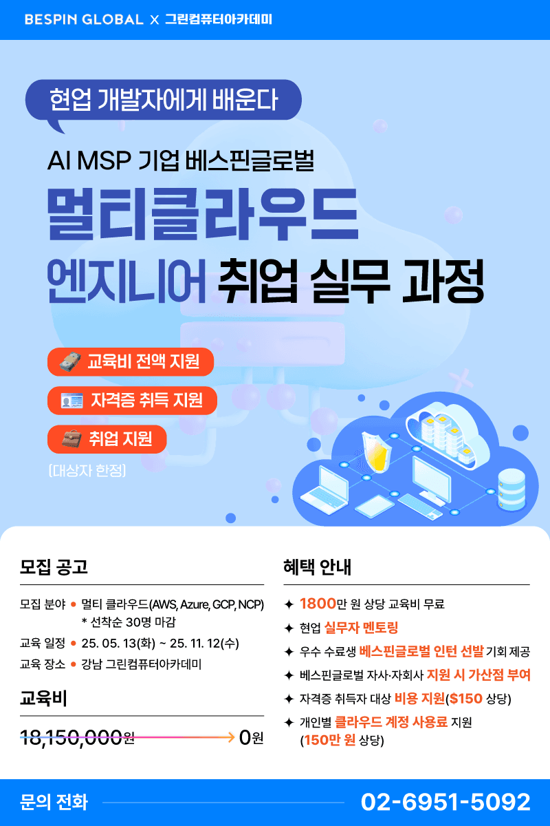 1) 타 과정의 클라우드 과정은 단일 클라우드(AWS, Azure, GCP, NCP 등)를 다루는 경우가 많지만 본 과정은 멀티클라우드를 다루며 프로젝트까지 진행하는 과정임