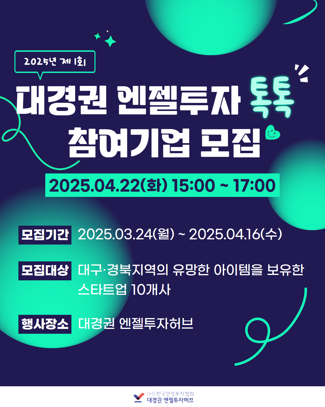2025년도 제1회 대경권 엔젤투자 톡톡』에 참여할 우수기업을 다음과 같이 모집합니다.
