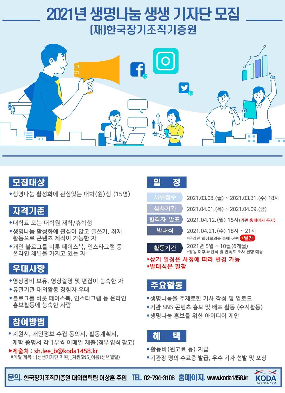 뇌사 장기 기증 및 인체조직 기증, 기증자 및 수혜자 이야기 그리고 KODA의 다양한 행사 등 생명나눔을 알리고 활성화하는 일에 관심있는 대학(원)생들의 많은 참여 부탁드립니다.