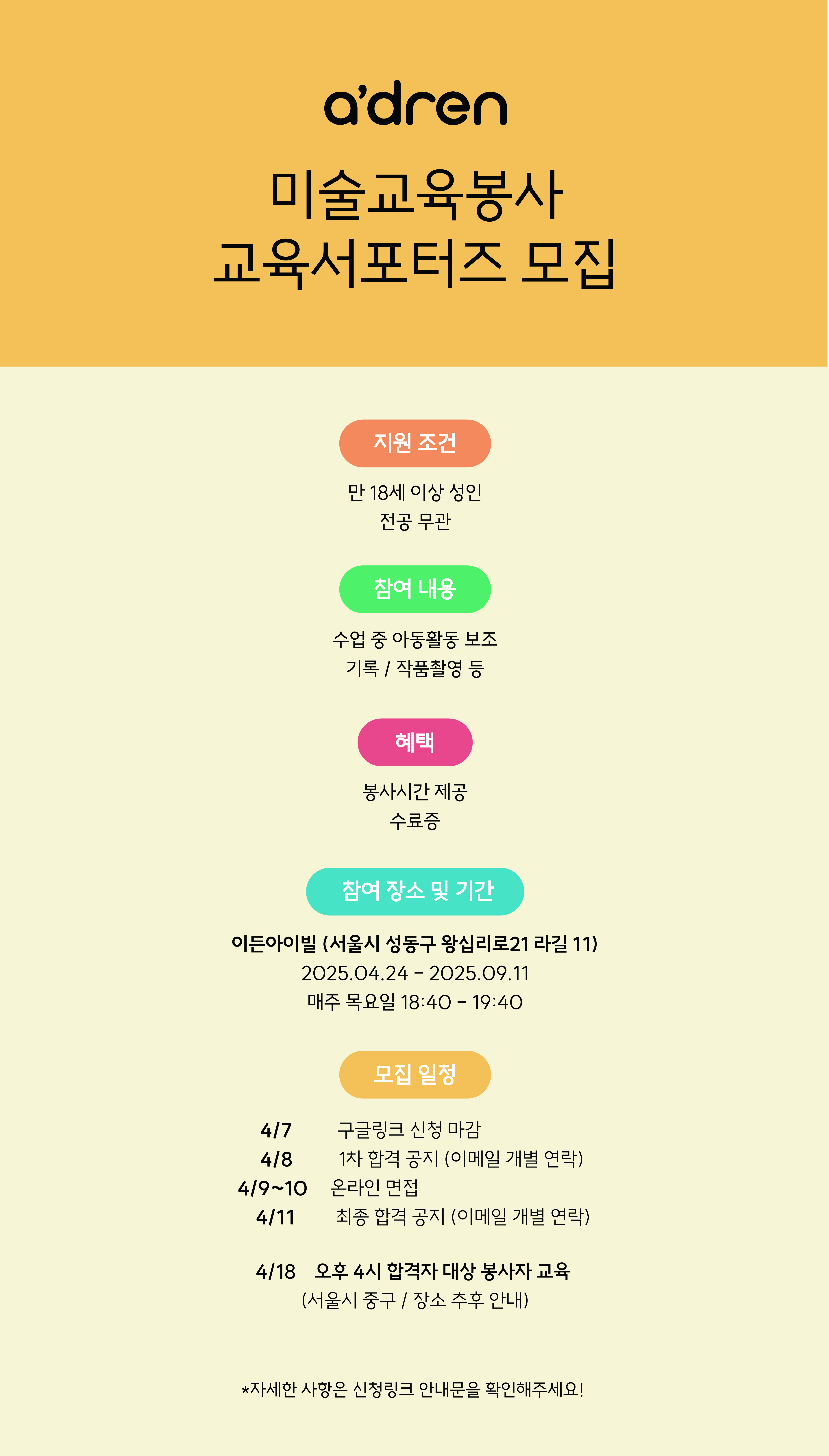 - 중요한 건 책임감과 아이들을 사랑하는 마음! 관련 전공자가 아니어도 지원하실 수 있습니다.