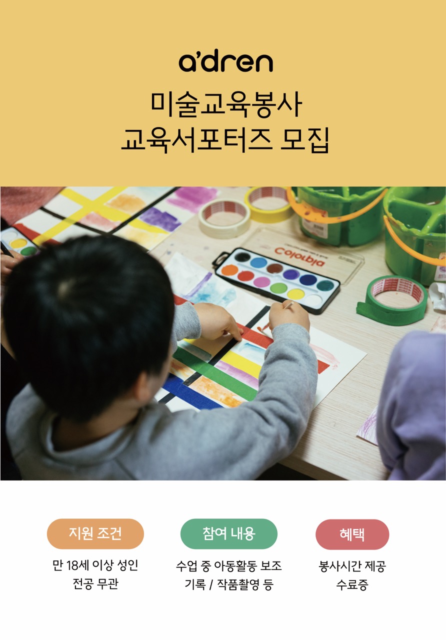 2015년, 에이드런은 뜻을 함께 해주신 서포터즈님들과 함께 수업을 시작했었고 지금까지 매년 자체적으로 미술교육봉사를 진행하고 있습니다.