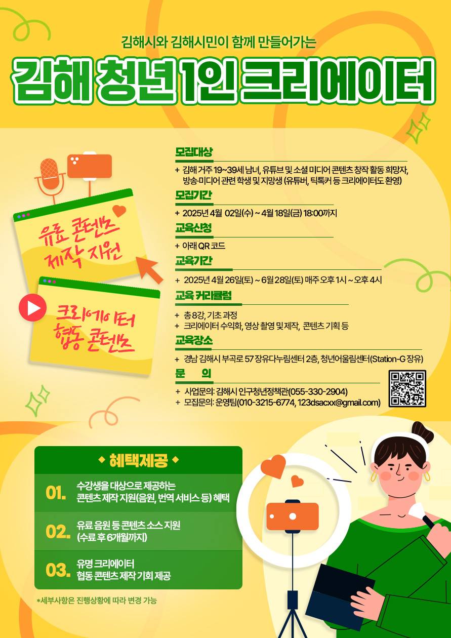 ✅ 모집대상 : 김해 거주 19~39세 남녀, 유튜브 및 소셜 미디어 콘텐츠 창작 활동 희망자, 방송·미디어 관련 학생 및 지망생 (유튜버, 틱톡커 등 크리에이터도 환영)