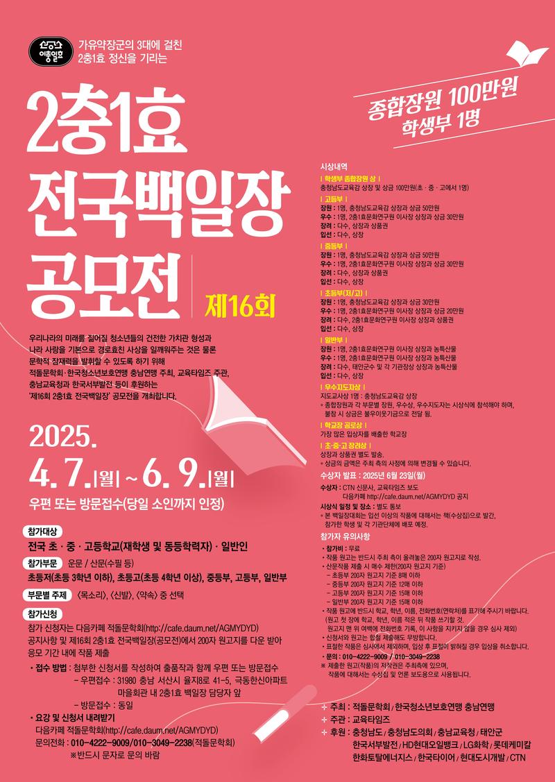 우리나라의 미래를 짊어질 청소년들의 건전한 가치관 형성과 나라 사랑을 기본으로 경로효친 사상을 일깨워주는 것은 물론 문학적 잠재력을 발휘 할 수 있도록 하기 위해 적돌문학회와 2충1효 문화연구원 공동 주최, 교육타임즈·한국청소년보호연맹 서산·태안지회 주관, 충남교육청 후원하는 '제16회 2충1효 전국백일장'공모전을 개최합니다.