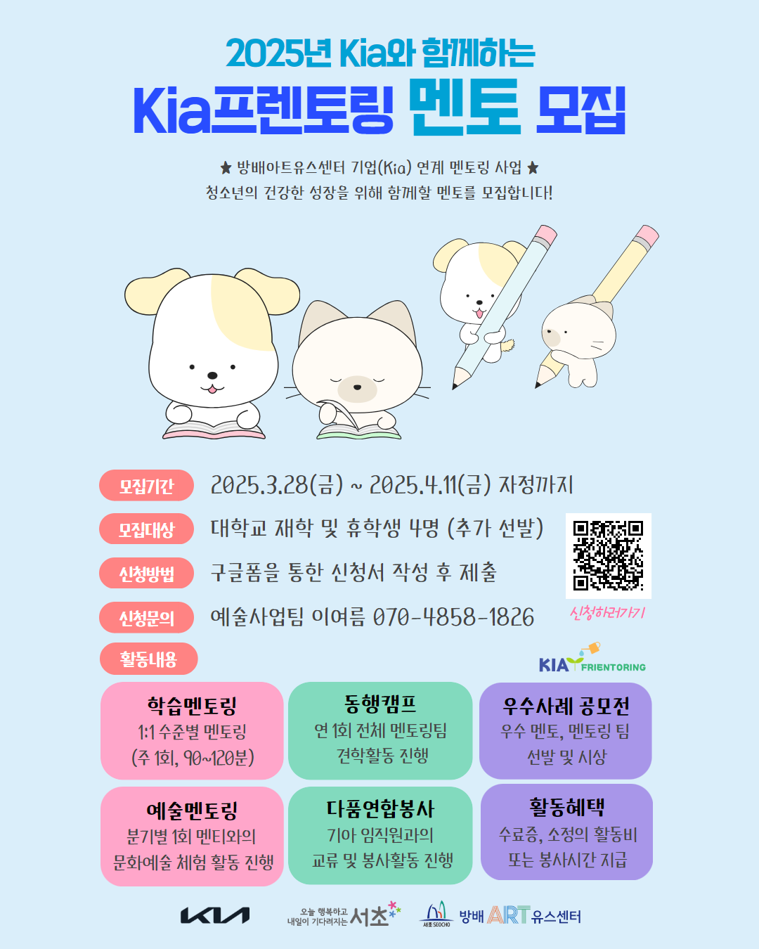 Kia주식회사와 방배유스센터가 진행하는 KIA프렌토링에서 청소년의 건강한 성장을 위해 2025년을 함께할 분들의 많은 참여를 바랍니다.