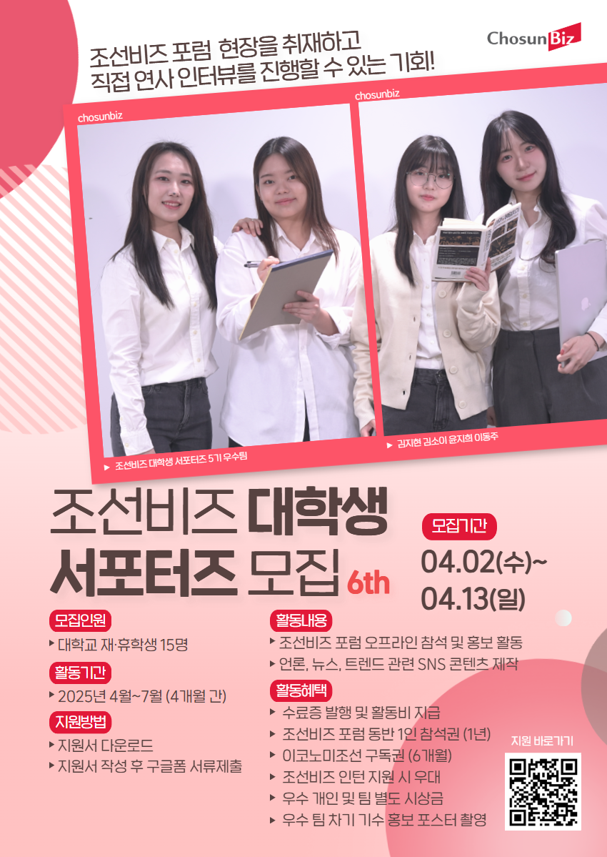 조선비즈 서포터즈는 조선비즈가 주최, 주관하는 다양한 행사 현장을 직접 취재하며 다양한 콘텐츠를 제작해볼 수 있는 대외활동입니다.