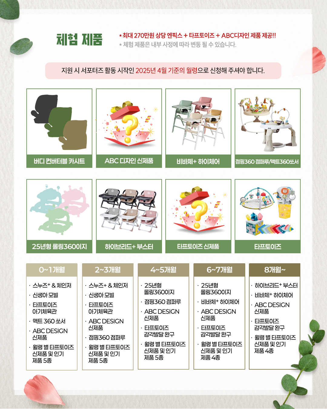 - 약 270만 원 상당의 엔픽스+타프토이즈+ABC디자인 제품 제공