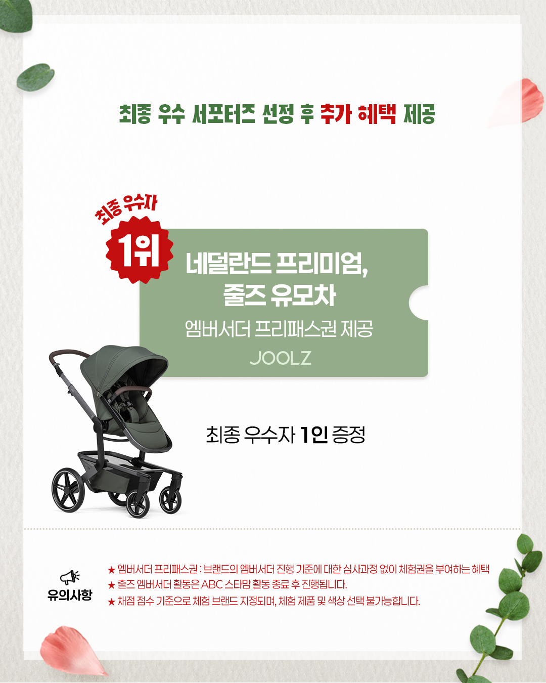 - 최우수 활동자 : 네덜란드 프리미엄 유모차 "줄즈" 앰버서더 프리패스권 (1인)