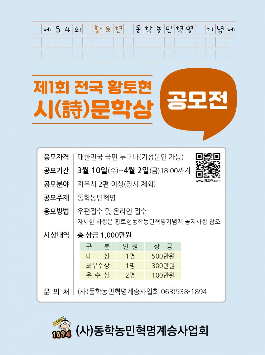 제54회 황토현동학농민혁명기념제를 맞이하여 “제1회 전국 황토현 시(詩)문학상 공모전”에 뜻과 마음이 담긴 시(詩)를 보내주세요. 동학농민혁명에 관련된 시(詩)공모전을 통해 민주주의의 출발점인 동학농민혁명의 역사에 관해 알 수 있는 기회가 되며, 동학농민혁명의 정신과 함께, 앞으로 나아가야 할 우리의 방향성을 제시해 줄 것입니다. 찬란한 우리의 역사, 동학농민혁명에 대한 여러분이 가지고 계신 이상과 뜻을 시(詩)로 전해주세요.