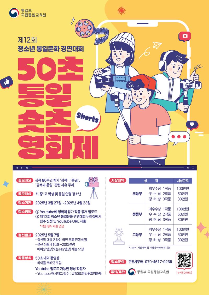 영화 좋아하는 청소년 다 모여라~! 제12회 청소년 통일문화 경연대회 [50초 통일 숏츠(shorts) 영화제] 참가자를 모집합니다!