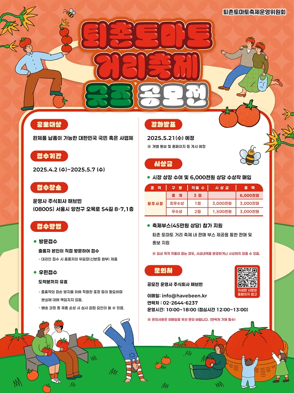 제23회 퇴촌 토마토 거리 축제를 맞이해 토마토를 활용한 특색있는 굿즈를 발굴하고 보급하기 위하여 『퇴촌 토마토 거리 축제 굿즈 공모전』을 아래와 같이 개최하오니, 많은 참여 바랍니다.