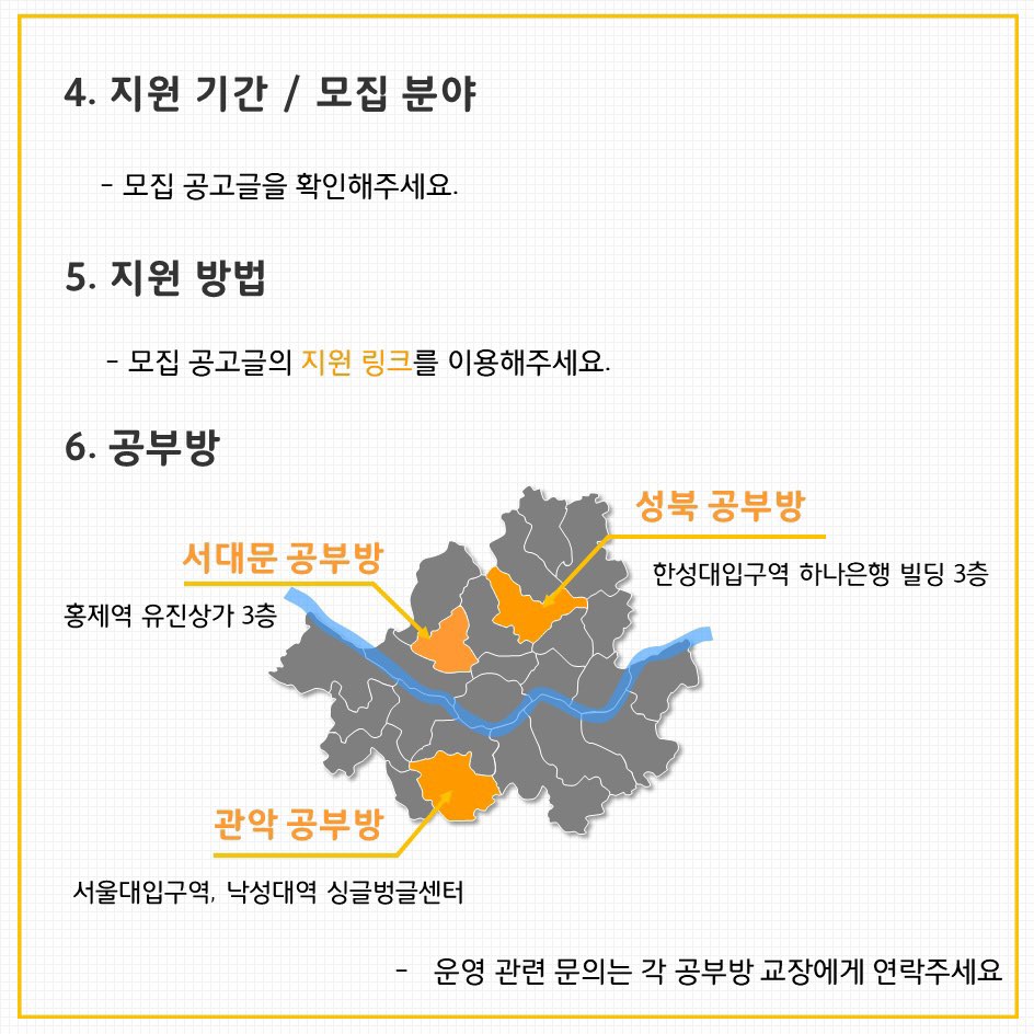 - 1) 주당 2회 19시~22시 수업 (공부방별로 약간의 차이가 있을 수 있습니다.),