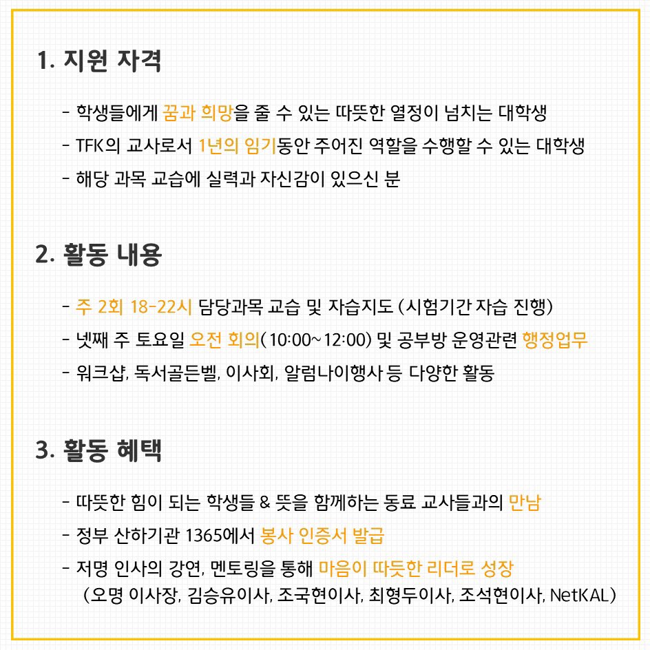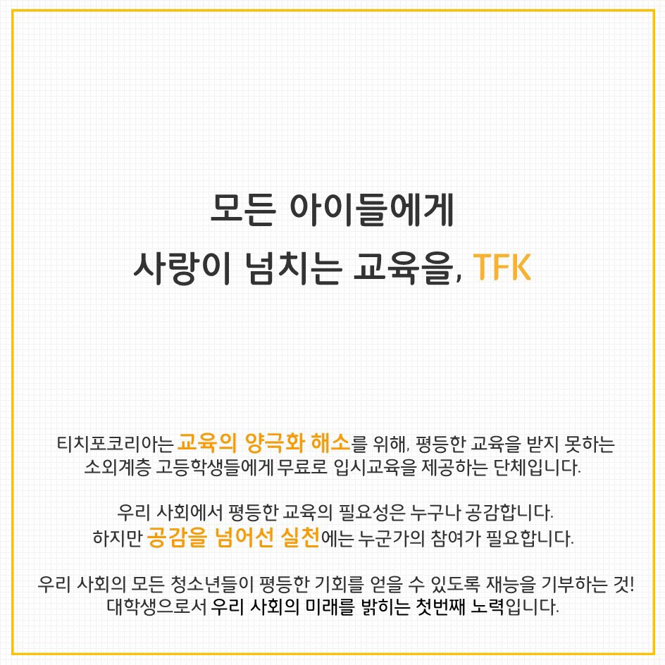 Teach For Korea는 교육의 양극화 해소를 위해서 가정 환경으로 인해 평등한 교육을 받지 못하는 학생(고등학생)에게 무료로 입시 교육을 제공하는 단체입니다.