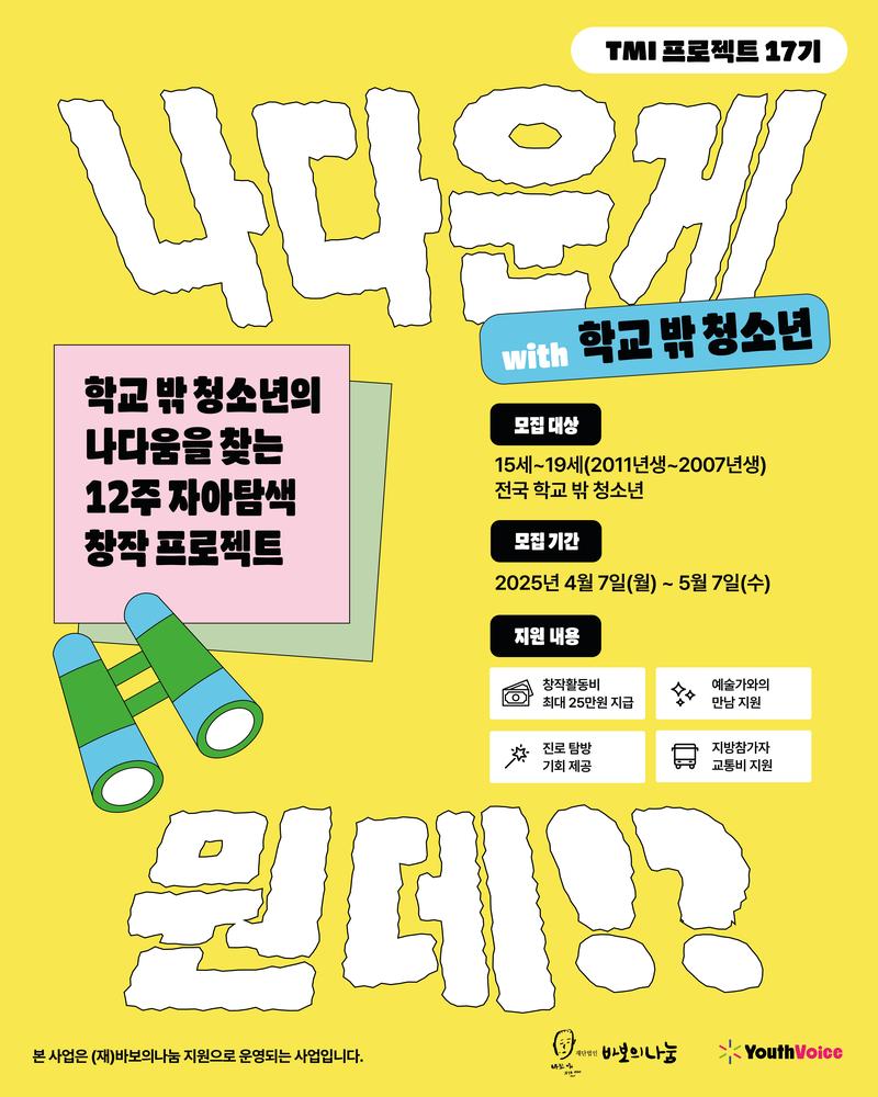 학교 밖 청소년을 위한 자아탐색 창작 프로젝트 <2025 TMI 프로젝트 17기>와 함께해보세요! 🎬