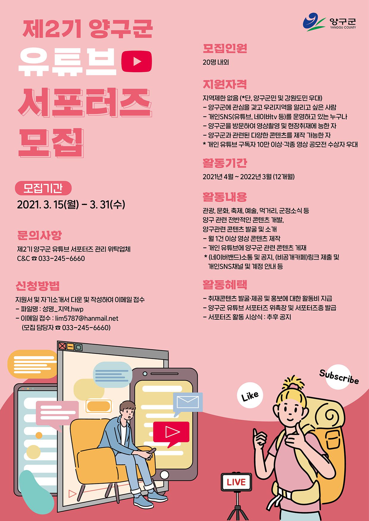 C&C(씨앤씨)에서는 전국의 국민들과 연계해 뉴미디어 분야의 양구군정 홍보를 강화하고, 양구의 청정 자연과 관광지 및 주요명소, 지역축제를 알리고 양구군 관광활성화에 앞장설 「제2기 양구군 유튜브 서포터즈 모집」하오니, 책임감을 가지고 성실하게 활동해 주실 분들의 많은 관심과 참여를 바랍니다.