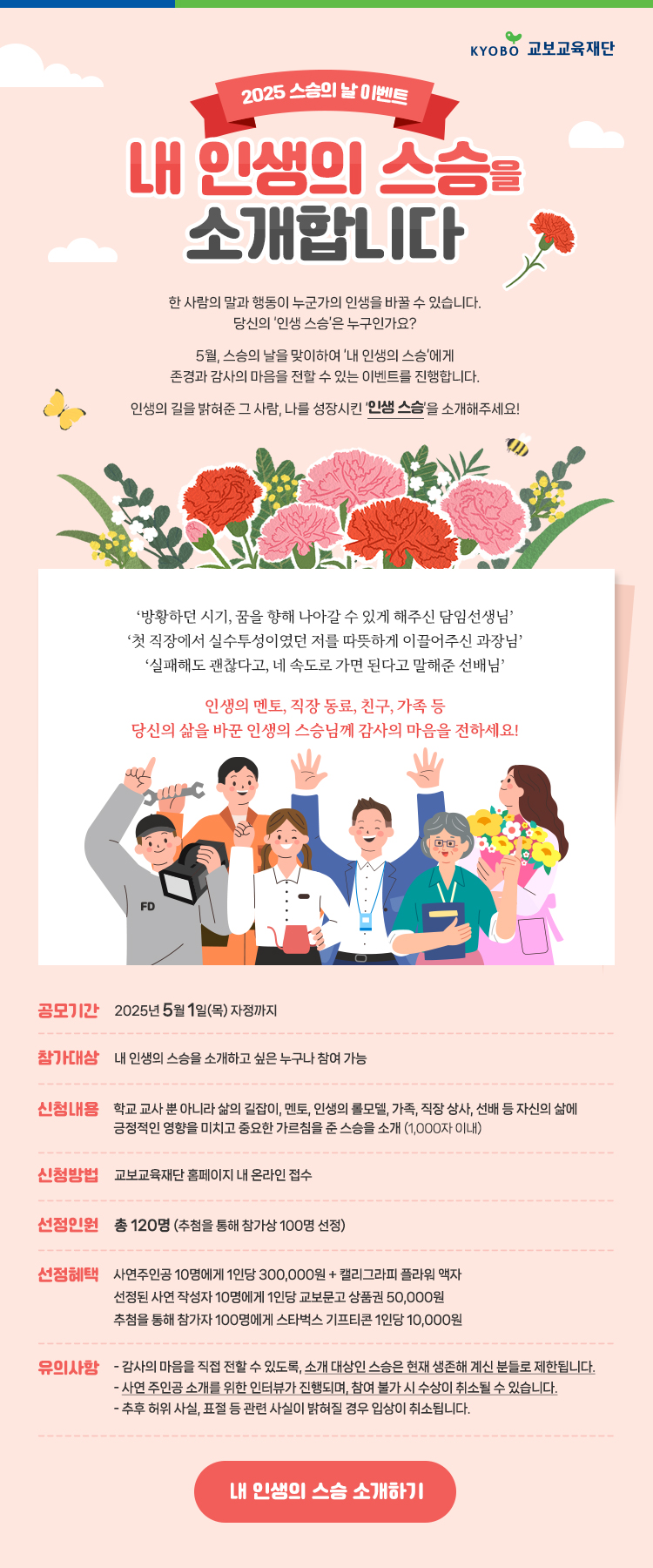 5월, 스승의 날을 맞이하여 ‘내 인생의 스승’에게 존경과 감사의 마음을 전할 수 있는 이벤트를 진행합니다.
