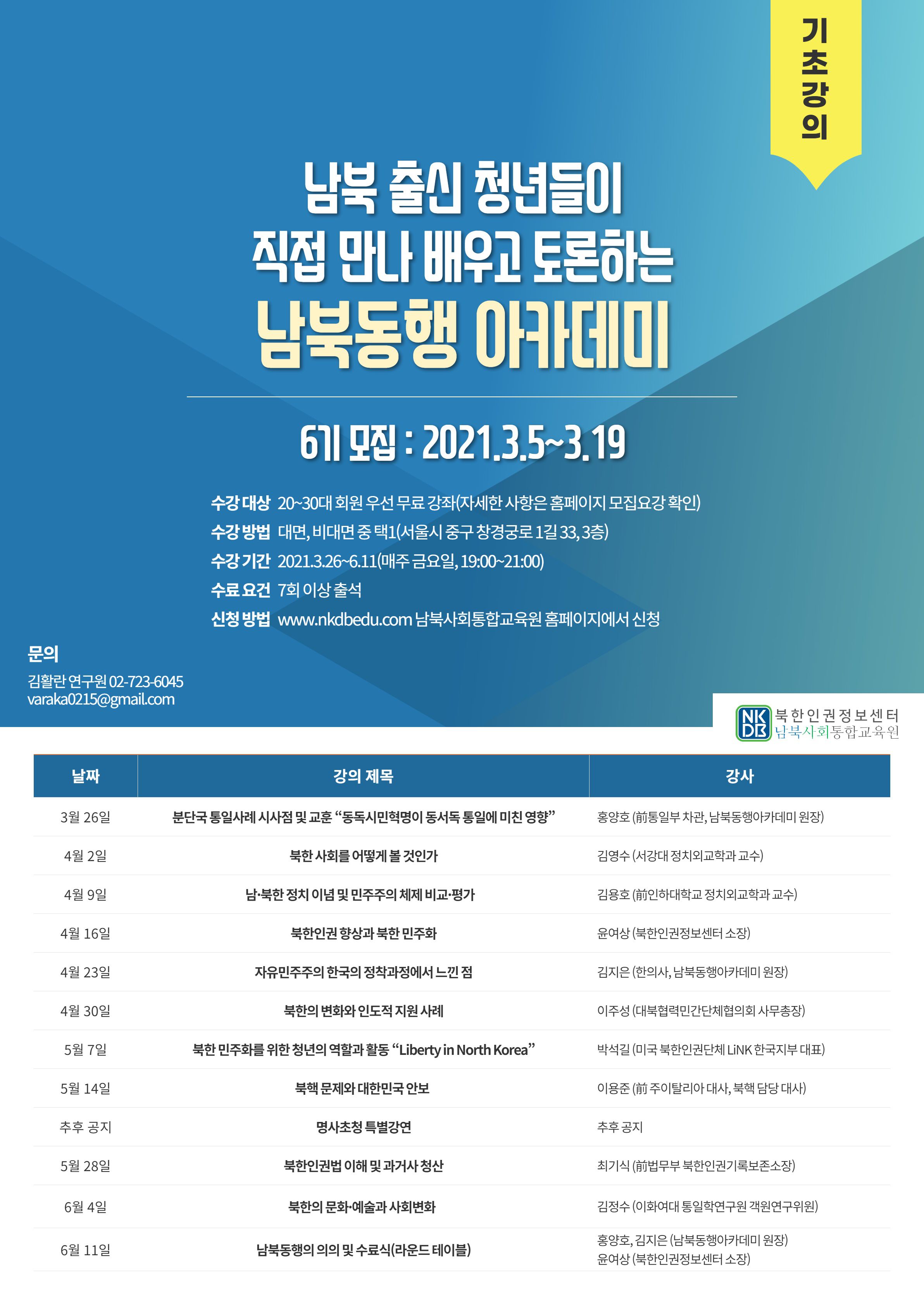 남북동행아카데미는 남북관계와 북한의 민주화, 인권 그리고 남북한 사회통합에 관심 있는 20~30대 남북 출신 청년들이 5:5 비율로 참여하여 위 주제에 대해 깊이 있는 탐구와 토론을 진행합니다. 이러한 과정을 통해 향후 한반도의 남북관계 문제를 주도할 실질적인 역량을 겸비한 통일대비 전문인력을 양성하는 것을 목적으로 합니다. 남북한 청년들이 함께 모이는 교류의 장에 참여함은 물론, 남북사회통합의 중요성과 합리적 방법론을 익히는 기회를 가져보시길 바랍니다.
