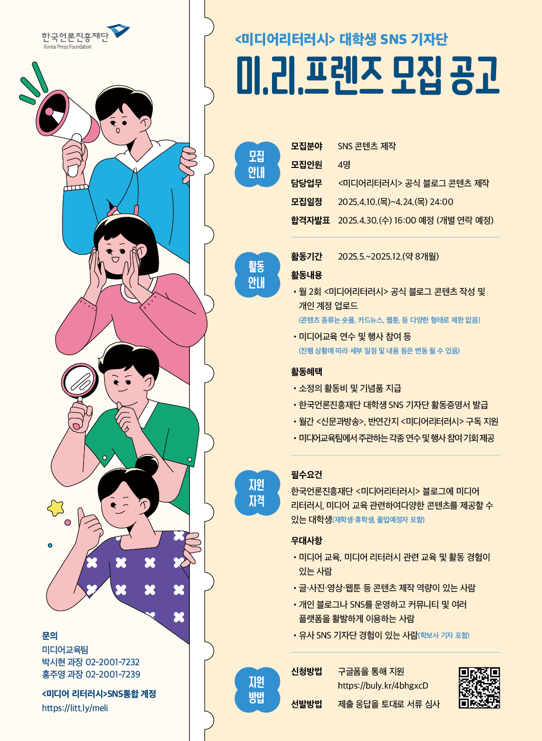 - 미디어 리터러시 및 미디어 교육에 관심 있고, 성실한 활동이 가능한 대학생 (재·휴학생·졸업예정자 포함)
