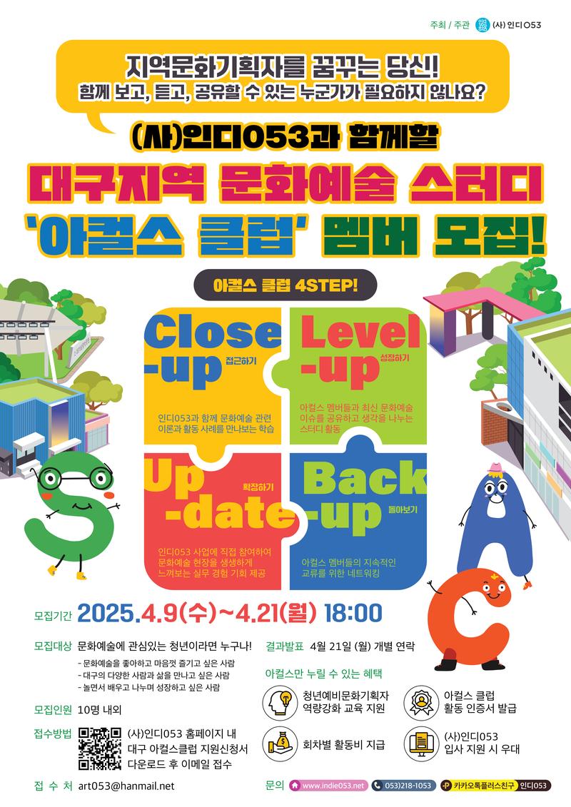 🙌 (사)인디053과 문화예술을 마음껏 즐기고 싶은 당신! 대구지역 문화예술스터디 <아컬스 클럽>으로 초대합니다! 🙌