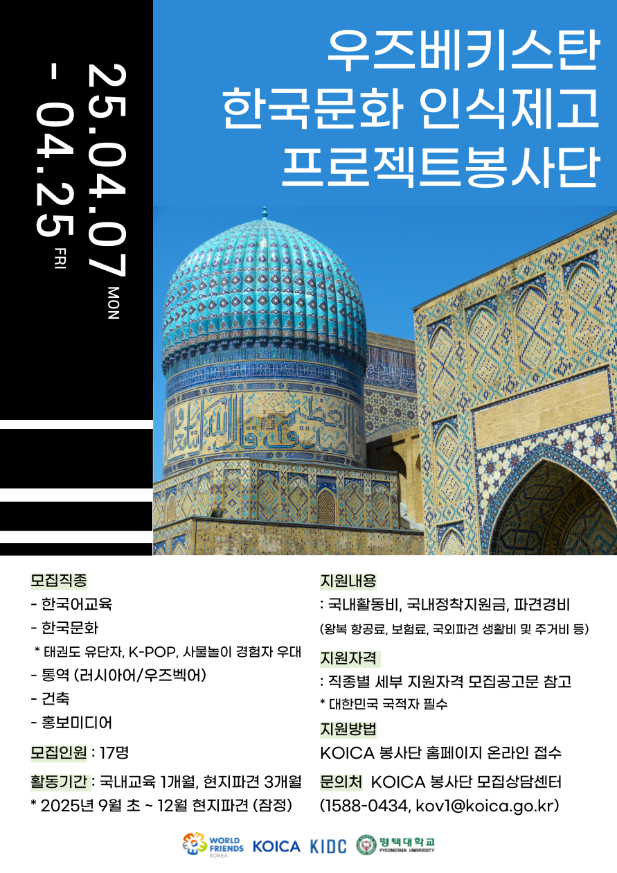 [모집] KOICA 우즈베키스탄 타슈켄트 지역 한국문화 인식제고 프로젝트 봉사단(3기) : ~ 2025.04.25. 16:00 마감