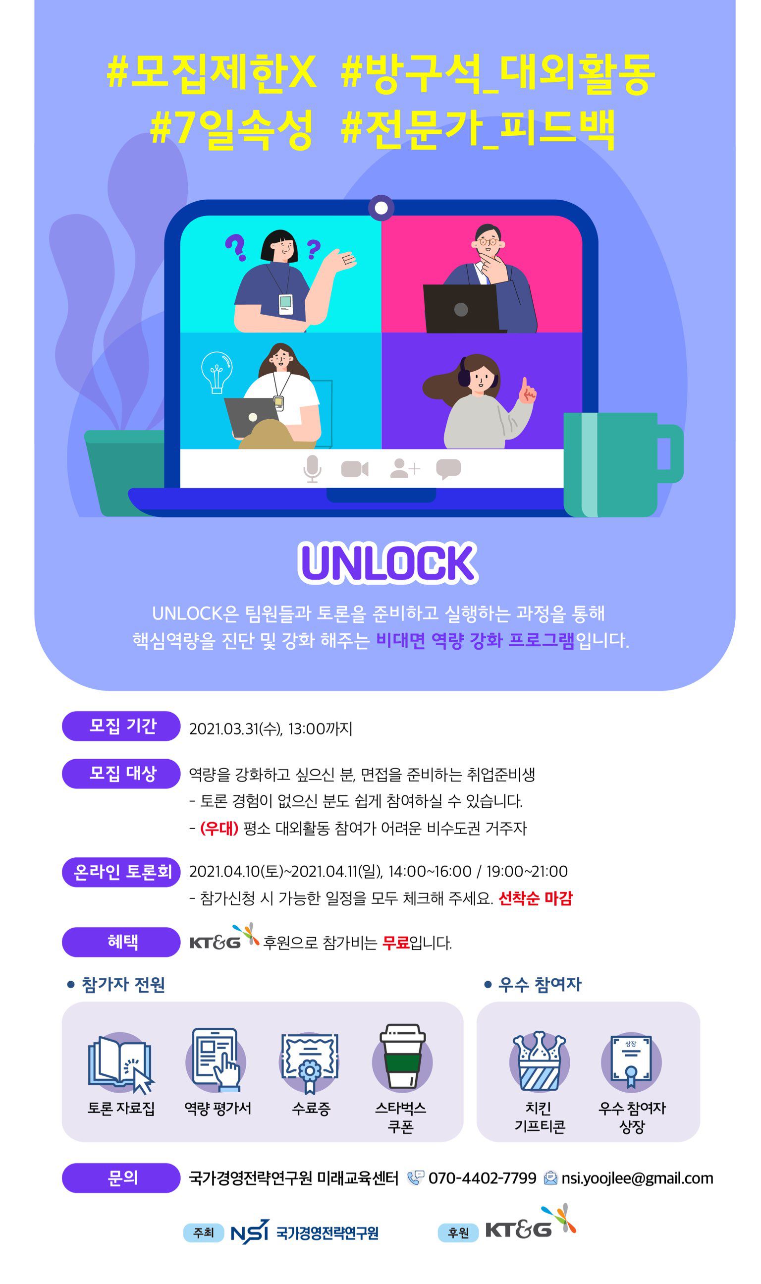 - 자세한 내용은 국가경영전략연구원(NSI) 홈페이지 "UNLOCK 소개자료"를 참고해 주시기
