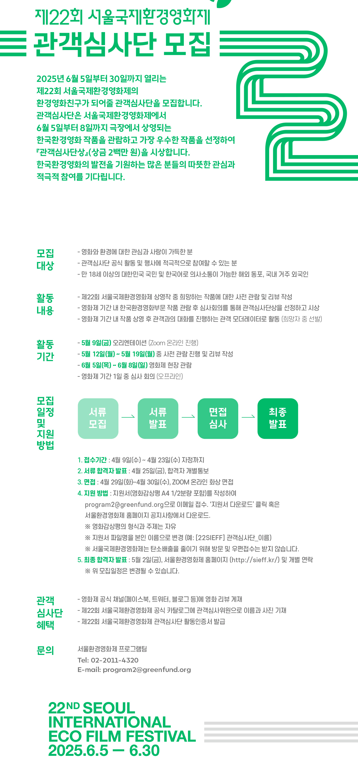 2025년 6월 5일부터 30일까지 열리는 제22회 서울국제환경영화제의 환경영화친구가 되어줄 관객심사단을 모집합니다. 관객심사단은 서울국제환경영화제에서 6월 5일부터 8일까지 극장에서 상영되는 한국환경영화 작품을 관람하고 가장 우수한 작품을 선정하여 『관객심사단상』(상금 2백만 원)을 시상합니다. 한국환경영화의 발전을 기원하는 많은 분들의 따뜻한 관심과 적극적 참여를 기다립니다.