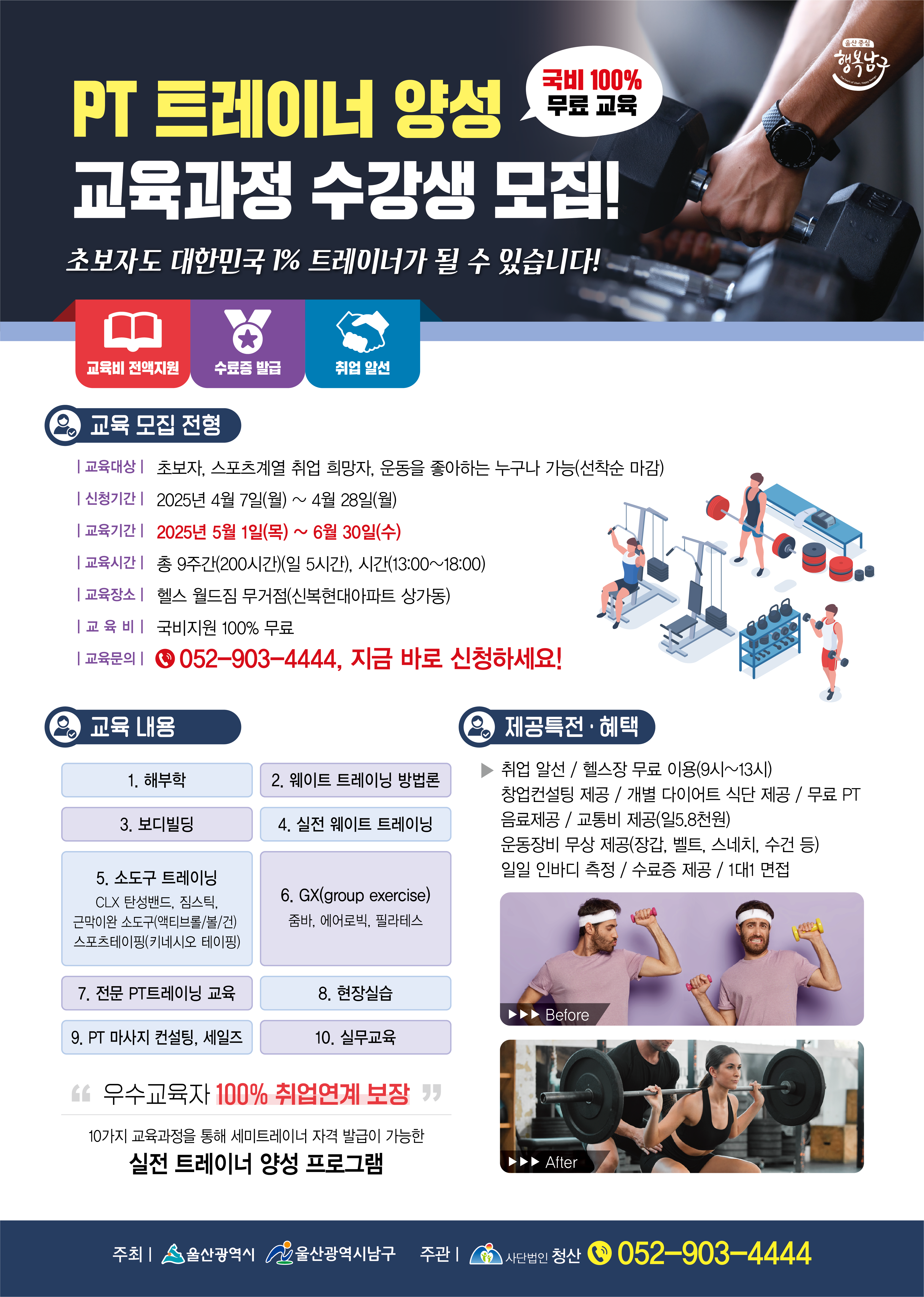 ◈ 신입,초보자, 학력 무관, 경력 무관, 울산 남구 누구나 가능, 스포츠센터 취직을 희망 하는 자