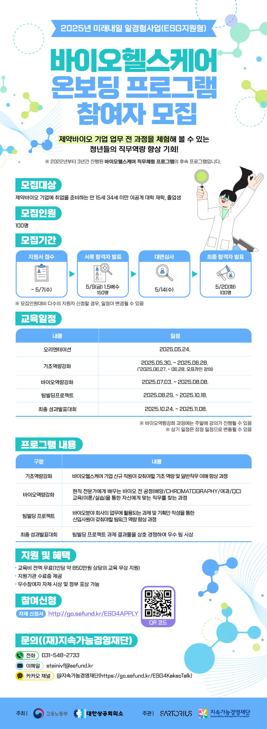 싸토리우스코리아바이오텍(유)와 (재)지속가능경영재단에서 운영하는 ‘바이오헬스케어 직무체험 프로그램’은 제약바이오 기업에 취업을 희망하는 청년들에게 직무 역량 향상을 위해 관련된 지식ᆞ체험을 제공하는 역량강화 프로그램입니다. 제약바이오 기업에 취업을 희망하는 청년들의 많은 관심과 참여를 바랍니다.