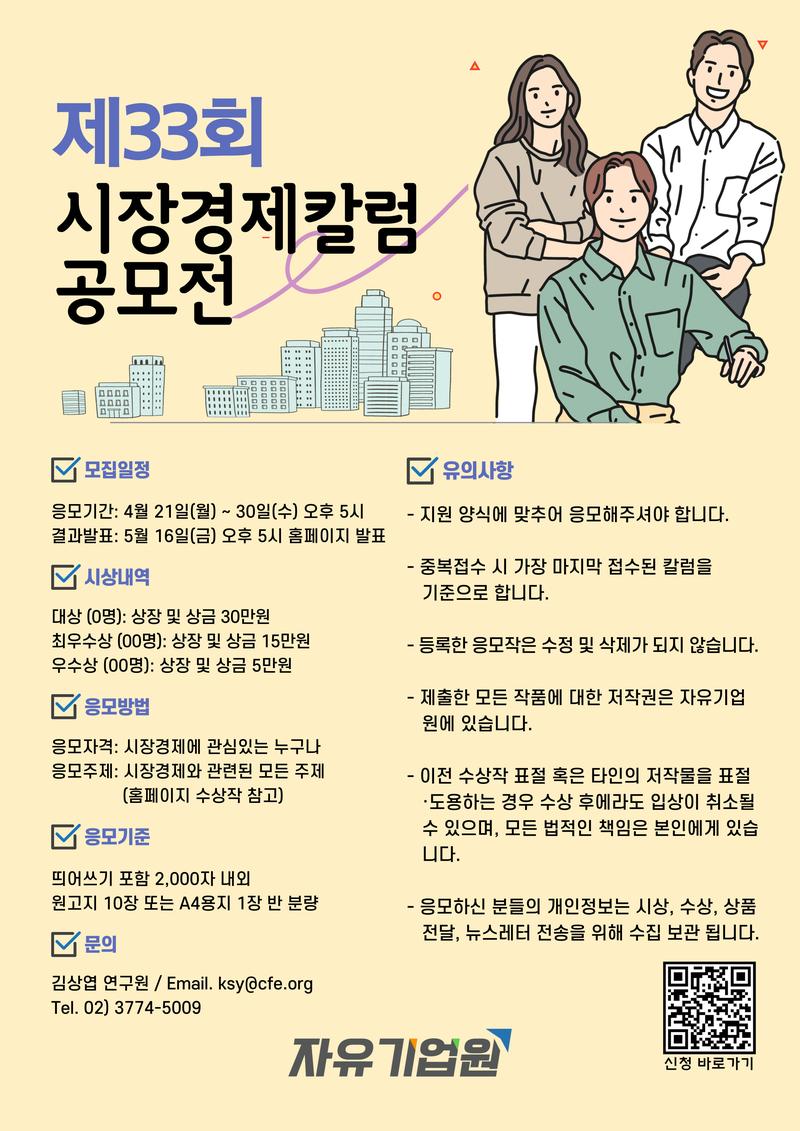 자유기업원에서 제33회 시장경제칼럼 공모전을 개최합니다. 시장경제가 관심있는 분들이라면 누구나 자유롭게 참여 가능합니다. 여러분의 이야기를 기다립니다!