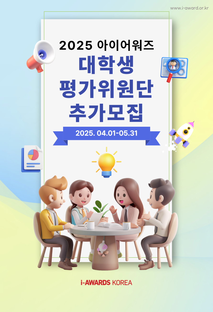 - 아이어워즈 공식웹사이트(www.i-award.or.kr)에서 개인회원가입 후 대학생평가단 신청