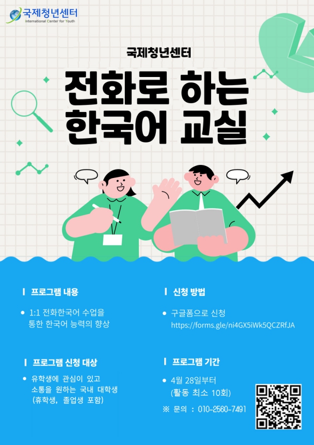 주한 외국인 유학생의 한국어 회화 능력을 향상하기 위한 프로그램으로 주 1회 유학생과 전화통화를 통해 유학생과 교류를 원하는 한국 대학생 봉사자를 모집합니다.