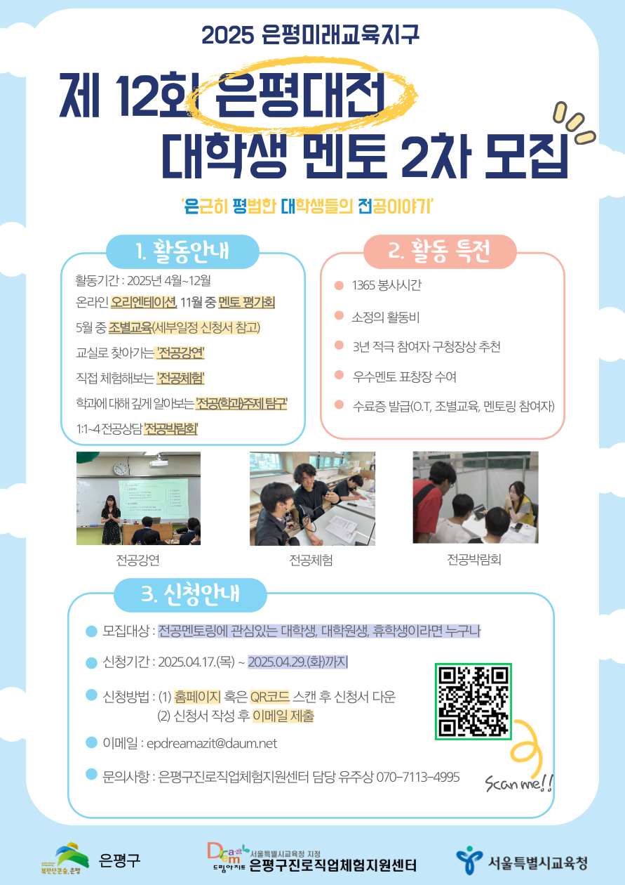 은평구진로직업체험지원센터에서 전공 멘토링에 관심있는 대학생 멘토를 모집하고 있습니다.