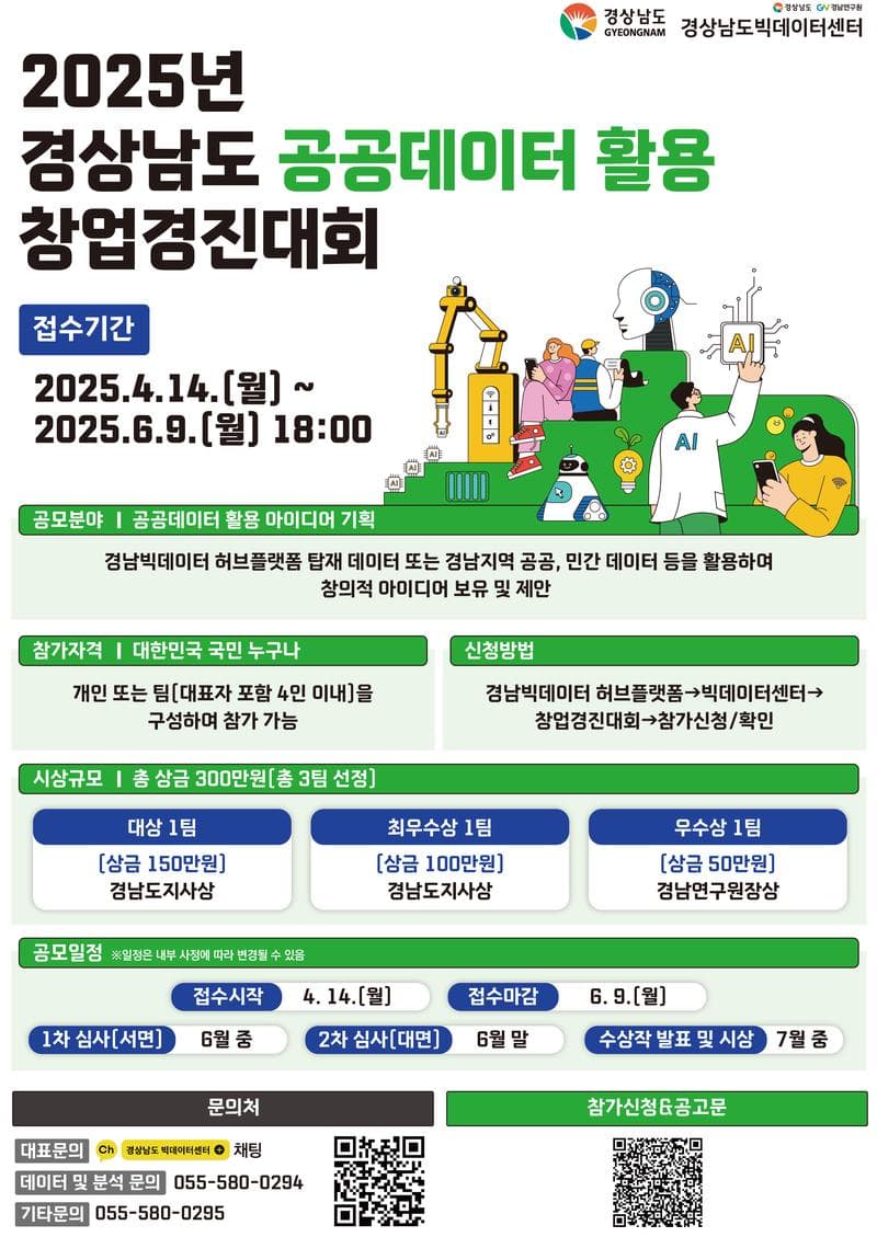 • 신청 방법: https://bit.ly/4jpa1my (경남빅데이터허브플랫폼→ 빅데이터센터 → 창업경진대회)