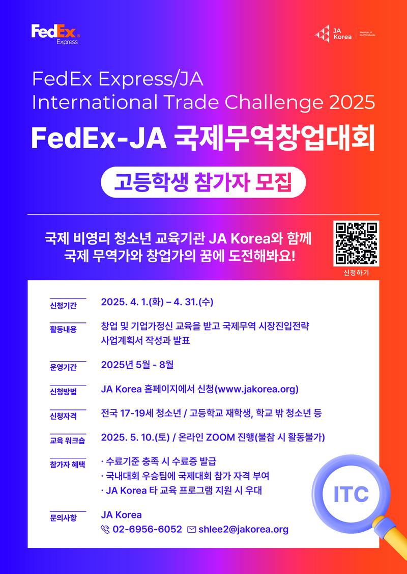 국제무역창업대회 2025 FedEx-JA Korea International Trade Challenge(ITC)에 함께할 청소년 기업가를 모집합니다!